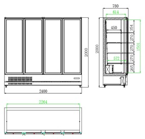 Avec ses dimensions extérieures de 2508 mm de largeur, 710 mm de profondeur et 1997 mm de hauteur, ce frigo vitrine offre une grande visibilité et un volume de stockage impressionnant. À l’intérieur, ses dimensions de 2418 mm de largeur, 545 mm de profondeur et 1569 mm de hauteur maximisent l’espace utile, tout en gardant un accès facile aux produits.